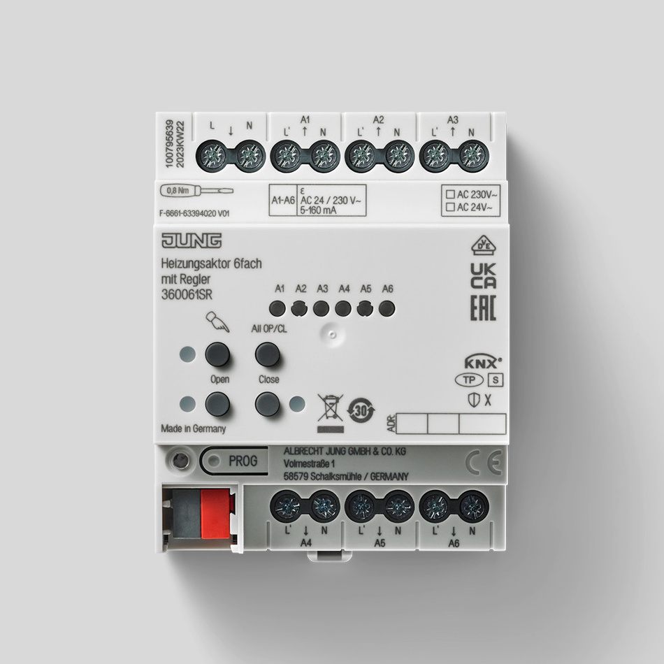 Präzise Ansteuerung von elektrothermischen Stellantrieben und beeindruckende Energieeffizienzfunktionen: JUNG stellt den KNX Heizungsaktor 6-fach mit Regler vor, eine innovative Lösung für die Steuerung von Heiz- und Kühlsystemen. Der Heizungsaktor ist eine zentrale Komponente für jedes moderne Heizsystem in einem KNX Smart Building. Mit seinen sechs elektronischen Ausgängen kann er bis zu vier (AC 230 V) oder zwei (AC 24 V) Stellantriebe geräuschlos steuern, wobei er sowohl mit spannungslos geschlossenen als auch mit spannungslos geöffneten Ventilantrieben kompatibel ist. Die integrierte Technologie ermöglicht eine nahtlose und effiziente Regelung der Raumtemperatur, wobei bis zu zwölf unabhängige Raumtemperaturregler (RTR) direkt in das Gerät integriert sind.